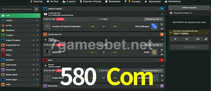 O 580 Com oferece uma grande seleção de opções de apostas em e-sports com probabilidades competitivas